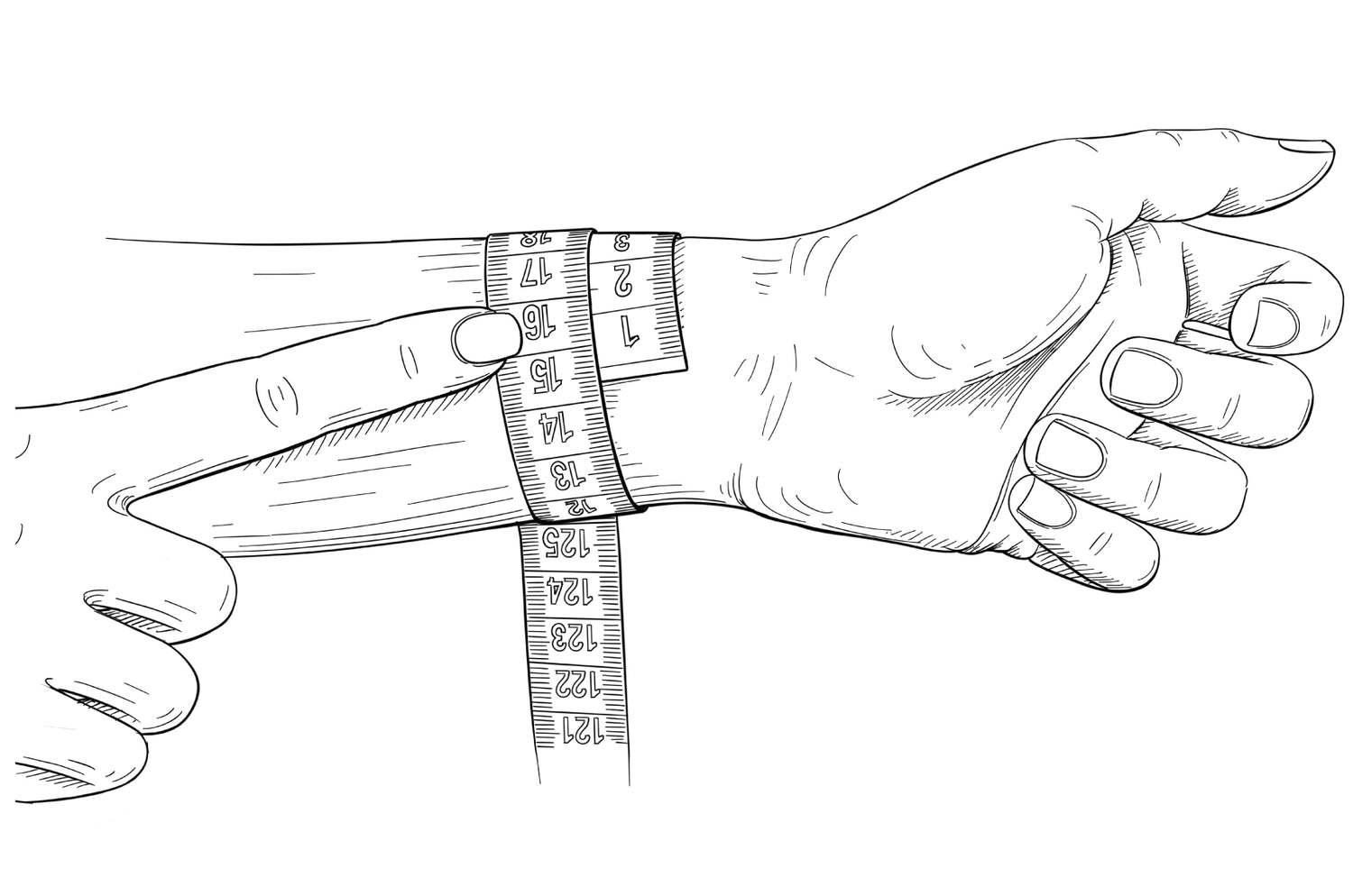 With your palm open and facing up, wrap the measuring tape around your wrist, just above your wrist bone. Note down measurement of your wrist size.